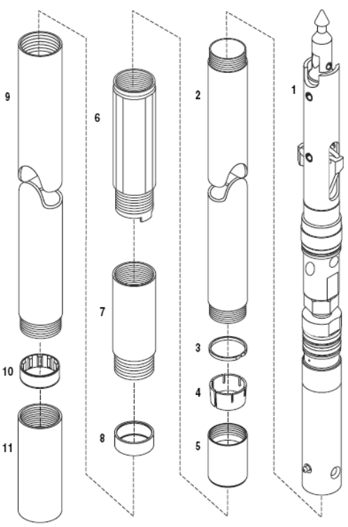 ООО «КАТАРИНА 2010» предлагает проверенные в полевых условиях стандартные колонковые наборы HQ, предназначенные для использования вместе с буровыми трубами HQ/HRQHP. Такой набор состоит из головного блока (деталь 1), компонентов внутренней трубы (детали 2-5) и компонентов внешней трубы (детали 6-11).